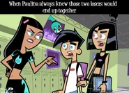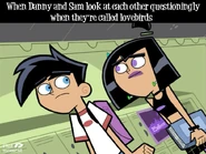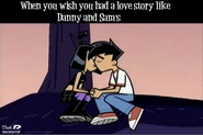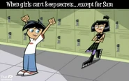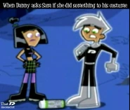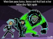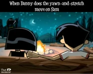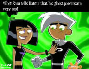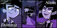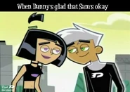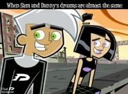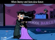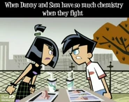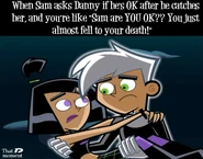Originally whenever anyone called Danny and Sam a couple, both denied having any romantic feelings for each other whatsoever. However, slowly as the series progresses, Sam and Danny both come to realize how they truly feel and begin to deeply fall in love as the series further progresses. Danny and Sam have also shared several kisses known as Fake Out, Make Outs to avoid situations that could trouble or endanger them, allowing the people viewing them to be distracted. Despite the kisses, Sam and Danny continue to deny their true feelings. Sam was the first to realize her true feelings for Danny as she admires his bravery and courageous actions, especially his most heroic moments, making her feelings for him grow even stronger than before. Sam also finds Danny very attractive as she secretly admires Danny and tries her best to hide her feelings, not wanting Danny to notice as shown in Fanning with Flames and Memory Blank. She is also known to be extremely jealous when Danny shows interest in other girls, particularly Paulina and Valerie. However, while Sam displays her jealously, she remains shy and nervous, and thus is unable to have the courage to confess to Danny her true feelings for him even in some of the most dire situations where Danny's life is in extreme danger such as Reign Storm.